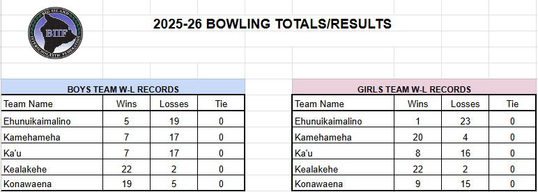 ![]() Please click this for detailed results. (note that there are tabs below the spreadheet for BOYS, GIRLS, etc.) BIIF BOWLING 2025-26 TOP 15 BOWLERS by Avg. (FINAL Regular Season Average) BOYS TOP 15 (Note: Must have bowled in minimum of 12 regular season games to qualify) Name School Season Average Games Bowled 1 CJ Felipe Konawaena 151.41 17 2 Zion Hanato Kealakehe 133.76 17 3 Ezekiel Wong Kealakehe 126.27 22 4 Jayden Gallardo Konawaena 121.77 22 5 Sean Kiyabu Kealakehe 117.09 22 6 Matthew Kiyabu Kealakehe 112.96 23 7 Kilauea Kaulia-Alani Ehunui 112.65 20 8 Kaysen Carveiro Konawaena 109.79 24 9 Khemrald Rivera Konawaena 109.2 20 10 Xachary Andres KS-HI 105.45 24 11 Landon Fukui KS-HI 104.1 21 12 Legend Padilla KS-HI 103.83 18 13 Nainoa Atkins Kealakehe 102.85 20 14 Emil Soriano Ka’u 94.88 16 15 Kaeowai Lincoln Ehunui 88.38 24 HIGH GAME OF SEASON = 203 **CJ Felipe (Konawaena), 10/17 AM vs. Ka’u Game 3 BIIF BOWLING 2025-26 TOP 15 BOWLERS by Avg. (FINAL Regular Season Average) GIRLS TOP 15 (Note: Must have bowled in minimum of 12 regular season games to qualify) Name School Season Average Games Bowled 1 Evelyn Montiel Rivero Kealakehe 138.42 24 2 Lahela Cootey KS-HI 126.62 13 3 Hiilei Kamoku Konawaena 116.14 21 4 Prayshus Kaaihue Konawaena 112.78 23 5 Mylin Wilson KS-HI 112.2 15 6 Olivia Kinoshita KS-HI 111.38 13 7 Zalea Gracidis-Ursua Ehunui 110.88 24 8 Kalena Okimura Kealakehe 108.67 21 9 Halia Kamoku Kealakehe 108.67 18 10 Heaven Hanato Kealakehe 106.17 18 11 Kamalei Macanas KS-HI 102.58 12 12 Jahnaiyah Kihe-Cambra Konawaena 98.38 24 13 Naya Morua Kealakehe 95.52 23 14 Kaira Okuhara Ehunui 92 18 15 Talia Wirtz Ka’u 90.27 15 HIGH GAME OF SEASON = 188 *Evelyn Montiel Rivero (Kealakehe), 10/4 PM vs. Ehunui Game 2 |